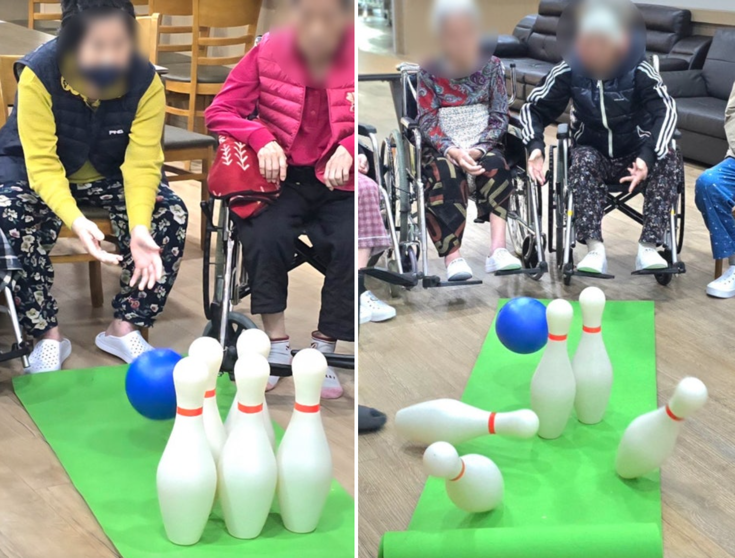 요양원에서는 어르신들과 함께 ‘힐링플러스-볼링’ 신체·인지 프로그램을 진행했습니다. 가벼운 볼과 안전한 핀을 활용해 팔·어깨 근력 사용, 손·눈 협응, 집중력 향상을 돕는 활동으로, 어르신들이 부담 없이 즐겁게 참여하실 수 있도록 구성했습니다. 볼을 굴려 핀이 쓰러지는 순간마다 곳곳에서 웃음과 환호가 이어졌...